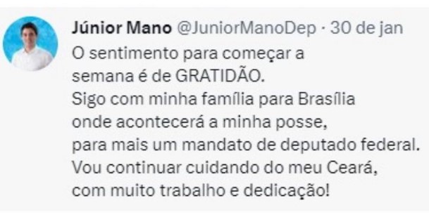 Através de suas redes sociais, Júnior demonstrou alegria pelo apoio popular e reforçou o seu compromisso com a população cearense. “Agradeço sempre a Deus por ser sempre generoso comigo, à minha família que é a base de tudo e aos amigos e eleitores que sempre confiam no meu trabalho. Contem com um deputado federal ainda mais comprometido e com garra e vontade de fazer mais pelo Ceará e o Brasil”, escreveu o parlamentar.